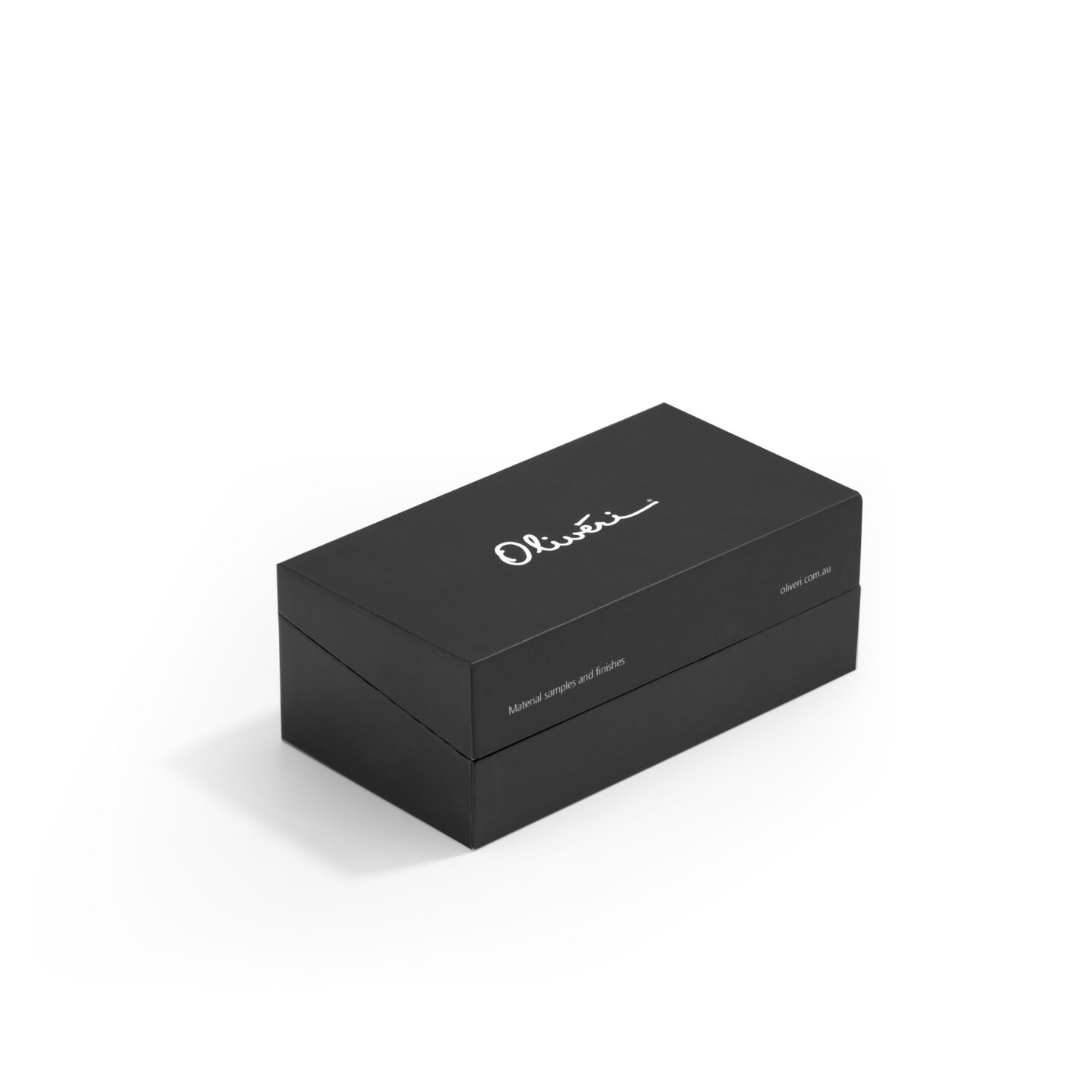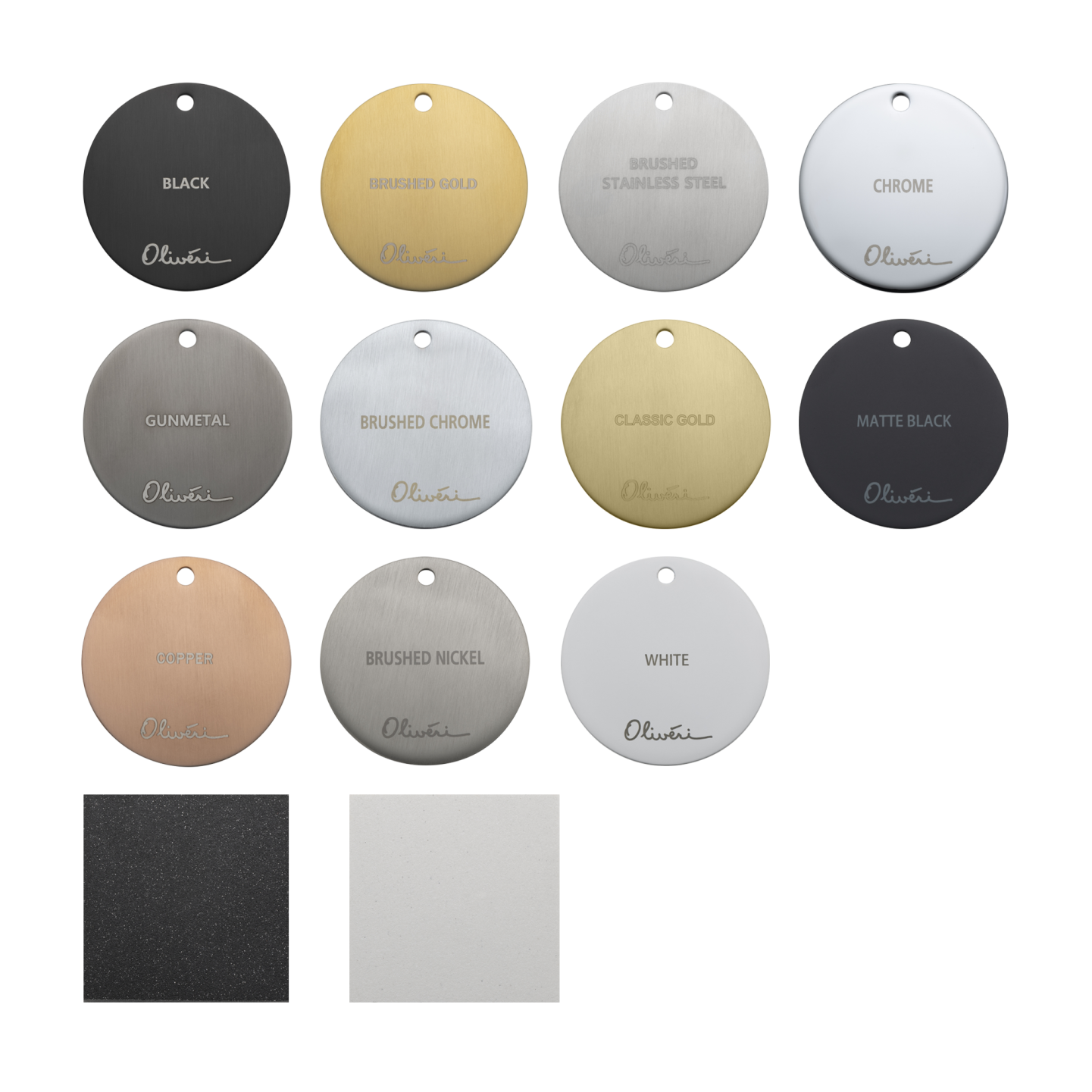 A collection of Oliveri colour finish samples representing kitchen sinks, kitchen and bathroom tapware, showers, kitchen and bathroom accessories.