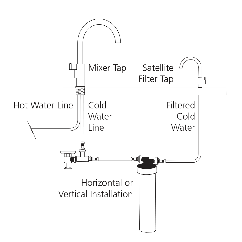 Choose an Inline System to filter water through an existing mixer • Use a Satellite System to deliver filtered water to a separate designer satellite tap (supplied) • Select a Filter Connection Kit to deliver filtered water to a 3-way mixer (sold separately) or an existing satellite tap.