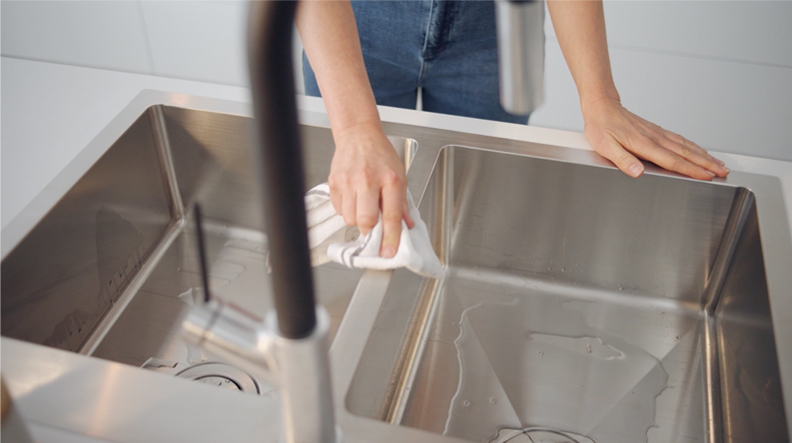 Rinse your sink clean after every use, and wipe it dry with a soft cloth or towel. If a mark appears, don’t be tempted to scrub it away. Wipe it with a damp soft cloth and gentle cleaning agent or apply a stainless steel polish.