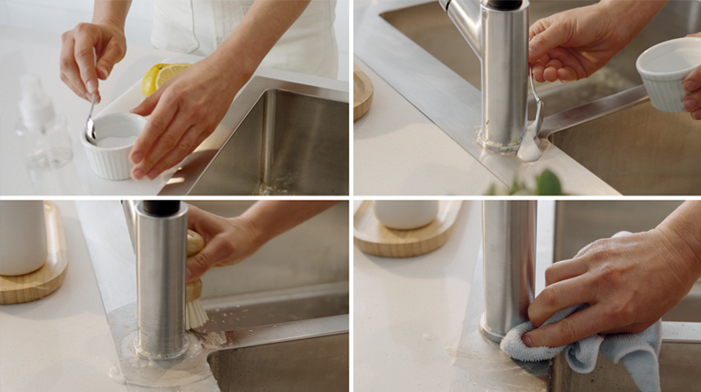 The third step, look out for a white or grey deposit on the surface. It’s most likely limescale which is easily removed. We recommend tackling it as soon as it shows up with biodegradable products, like bi-carb soda, and vinegar or lemon.This won’t harm your sink’s surface. Rinse with clean water and towel dry.