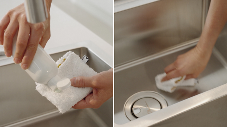 Step two is at the end of the day, clean your sink’s surface thoroughly. Squeeze some detergent onto a soft sponge and wipe the sink in the direction of the sink’s brushing. A quick tip, avoid circular movements. You’ll be able to see the direction of the brushing if you look at the stainless steel from an angle. Rinse with water and towel dry.